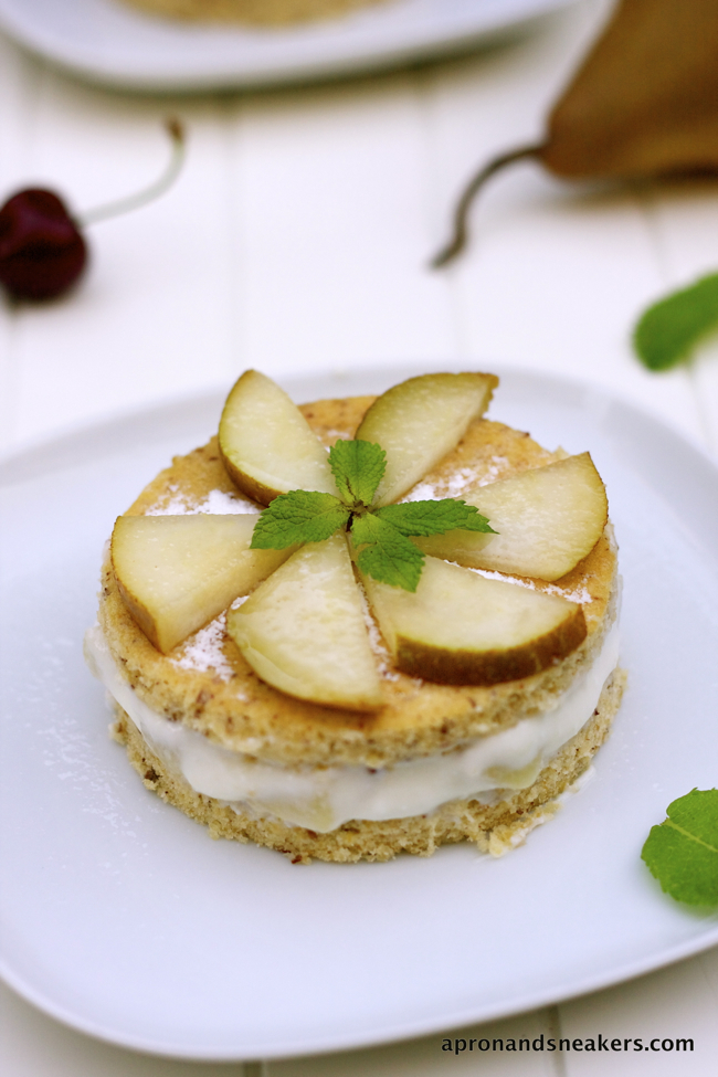 Now let me tell you about these cakes. I found a lot of recipes to make this cake but this particular one jumped out at me. It seemed like the ones that my husband had in a couple of restaurants that were really unforgettable and the recipe came from a chef in Amalfi Coast. Then it uses more almond flour than regular flour. The cake itself should taste wonderfully almondy. And I was right! The cake was really, really good. Between the cherry and the pear version, we both preferred the pear. The cherry was excellent too, but the pear provided us with a delicacy in taste that married well with the almond cake and ricotta.