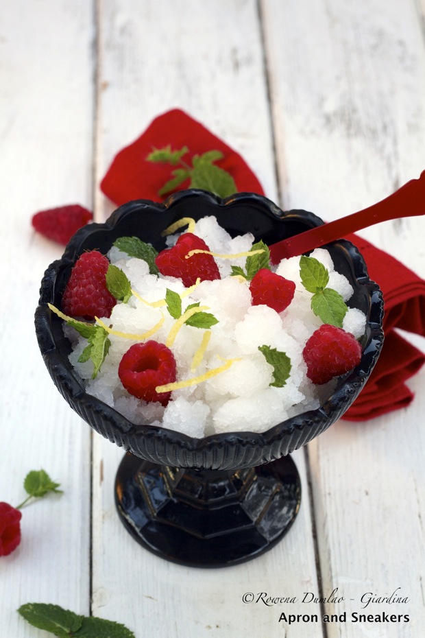 Since there is this great love to this flower juice at home, I made something fitting for the very hot days we are going through. Elderflower granita with lemon zest, fresh raspberries & mint is a spectacle to see and taste!