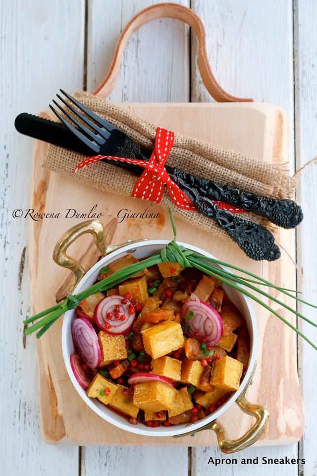 It is fried tofu cubes with boiled pork. Originally, the parts used were taken from the face but since it already evolved to something more likeable, pork belly is widely used. So if ever you go to the Philippines, ask first what part of the pork they are using. I am quite squeamish so I always ask first and in this dish, I used pork belly. The original way to cook the pork is to boil it for about half an hour, until it becomes tender. I do this when I have the time but when I am in a rush, I do my shortcut method which is to fry the pork too. The purists will make a no-no to that because the pork should absorb the sauce but just the same, I love both ways.