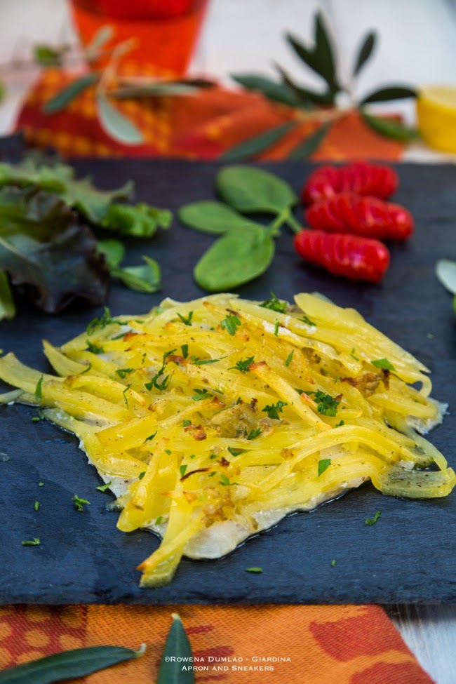 This recipe is very easy to make, the only thing that requires a little bit of work is the slicing of the potatoes as thinly as possible. If your food processor has a julienne disc attachment then there really is no work entailed in this baked fish. Just put the potatoes on top of the fish fillet then bake them until cooked through. By the time the oven rings, it's time for me to move and pick up my daughter.