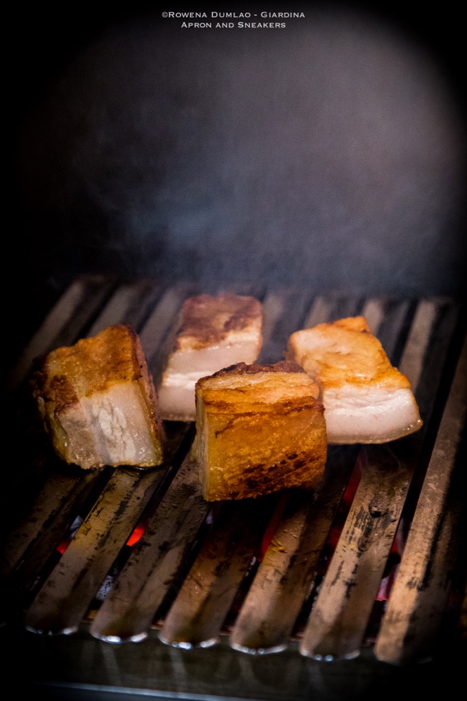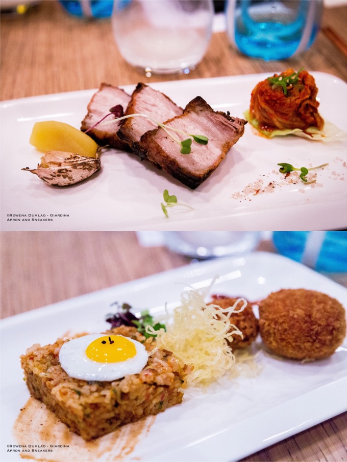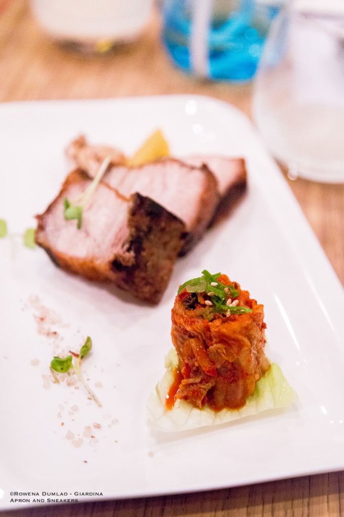 The bokkeumbap that came in two versions: fried balls of fried rice with kimchi and fried rice mixed with kimchi and topped with sunny side up quail egg. As the main course, Chef Daniel Kim made tong samgyopsal gui (pork belly with kimchi) served with a slice of cooked apple with pepper and cooked clove of garlic.