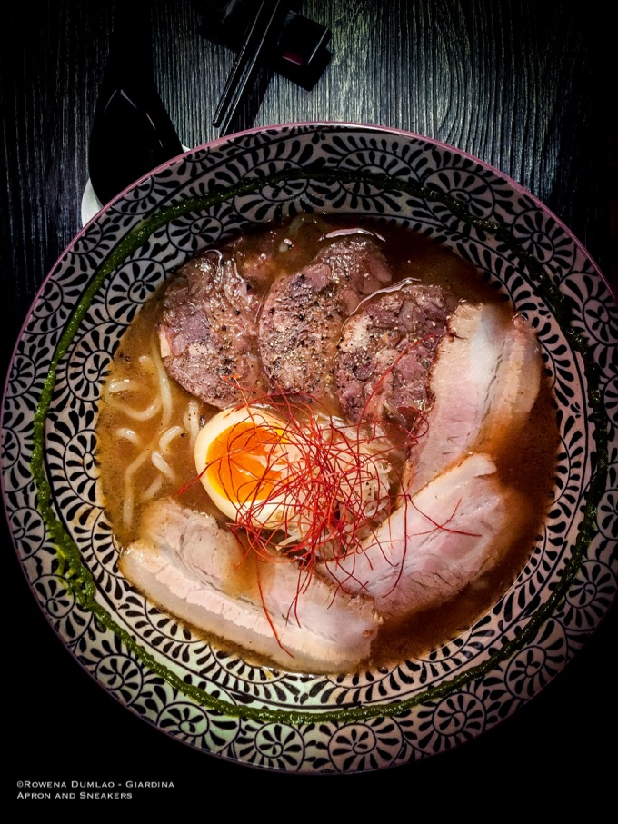 | Gyu tail ramen with aji tamago and buta kanuni (Oxtail ramen with boiled egg marinated in soy sauce and pork belly stewed in star anise and sweet soy sauce) |