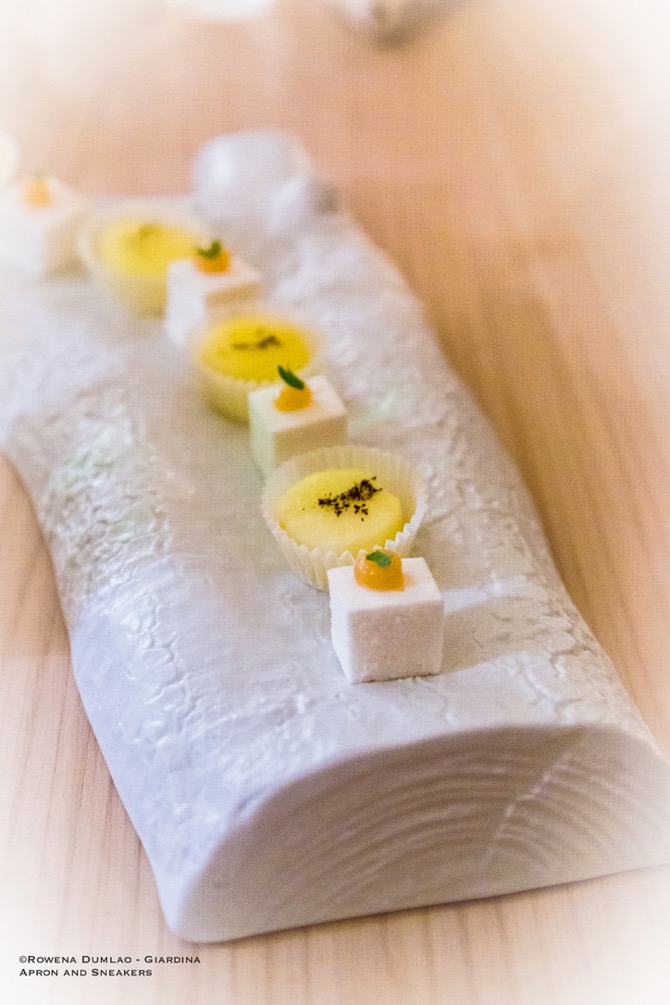 The cuisine has determined flavors which gives access to the untrodden path of gastronomy. Dining at Aga stretches your palate into a different height but at the same time, guides you to a different window of gastronomy with harmonious elements. My favorite is the Calamaro di Montagna (Squid of the Mountain) skewered and served on an alpine stone. It is totally reminiscent of grilled squid with the aroma and flavor that it evokes but in reality, it is actually made of egg whites.