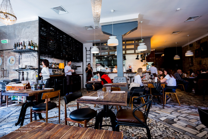 Terracotta brick walls, stone flooring, wooden tables and decors in black and neutral tones make up an industrial chic atmosphere. The kitchen is visible to the diners giving the possibility to see the chefs at work. During the warm season, there is outside seating in addition to the ample accommodation indoors. The overall friendly ambience gives every guest who walks in a pleasant dining experience.
