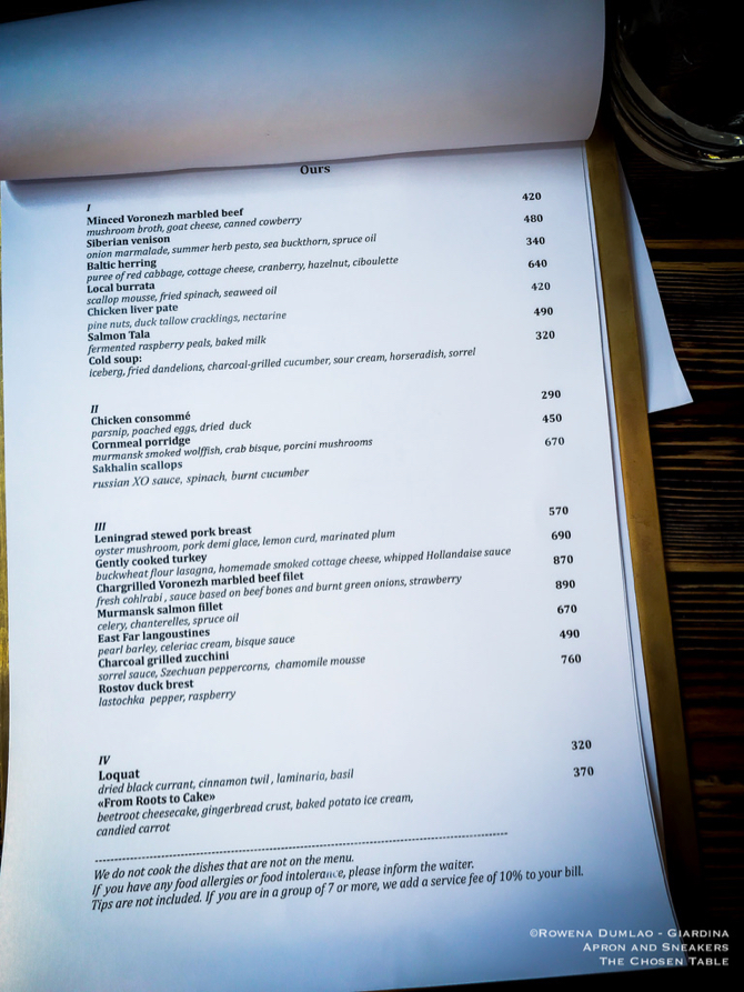 Siberian Omul Stroganina (Rubles 540 / €7.50) is a traditional dish from the Arctic Siberian thinly-sliced frozen raw fish. Cornmeal Porridge (Rubles 390 / €5.50) is a dish of smoked Murmansk wolffish, crab bisque and porcini mushrooms. Langoustines (Rubles 870 / €12) with pearl barley, celeriac cream and bisque. Dry-Aged Rib Eye Steak of 36 days with malt sauce, Jerusalem artichoke purèe, porcini mushrooms and pecan (Rubles 2,400 / €33). From Roots to Cake (Rubles 370 / €5) is a curious dessert of beetroot cheesecake, gingerbread crust, baked potato ice cream and candied carrot that combines different flavors of saltiness and sweetness.