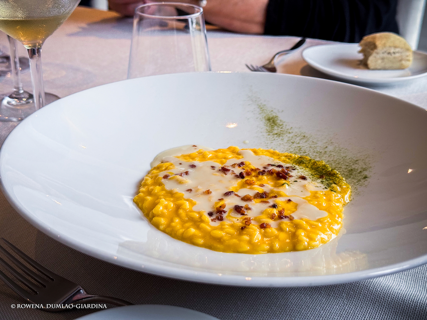 The second tasting featured Fiano di Avellino DOCG 2023, a stainless steel-vinified expression of Fiano that preserved its fresh, mineral notes. Paired with a delicate seafood and vegetable dish, the wine’s vibrant, mineral-driven character elevated the flavors of the pairing. Finally, we tasted Aglianico Campania IGT 2021, a wine aged in a combination of wooden barrels and stainless steel, which revealed a balanced structure and depth. This wine paired beautifully with risotto topped with crispy pancetta, followed by a rich meat course, where its boldness harmonized with the dishes’ hearty flavors.