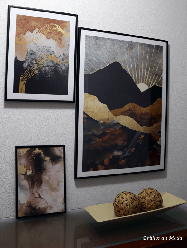 Desta vez, optei por escolher quadros abstratos para decorar uma parede do corredor. Tirei algumas fotos para vos mostrar.