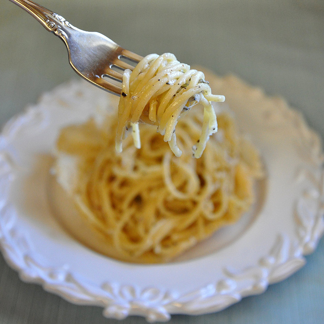 Cook the pasta according to the directions for that brand. When the pasta is not quite cooked, about 3 minutes before you would normally take it out of the water, add the boiling pasta water, the butter and the pepper to a hot saute pan. Add the drained pasta to the pan and toss through the water mixture until the pasta absorbs almost all of the water. Remove from the heat, and add the grated cheese to the pasta. Quickly stir the cheese into the pasta. Place into the Parmesan cup and garnish with more grated cheese and freshly grated pepper, to taste.