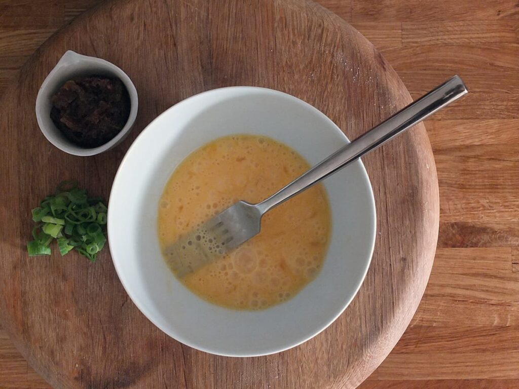- Whisk 3 free-range eggs with a fork.