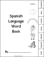Spanish Word Book A Printable Activity Book A short, printable activity book in Spanish/English (with tabs), with pages on numbers, telling time, colors, food, people, and animals - plus a quiz. |