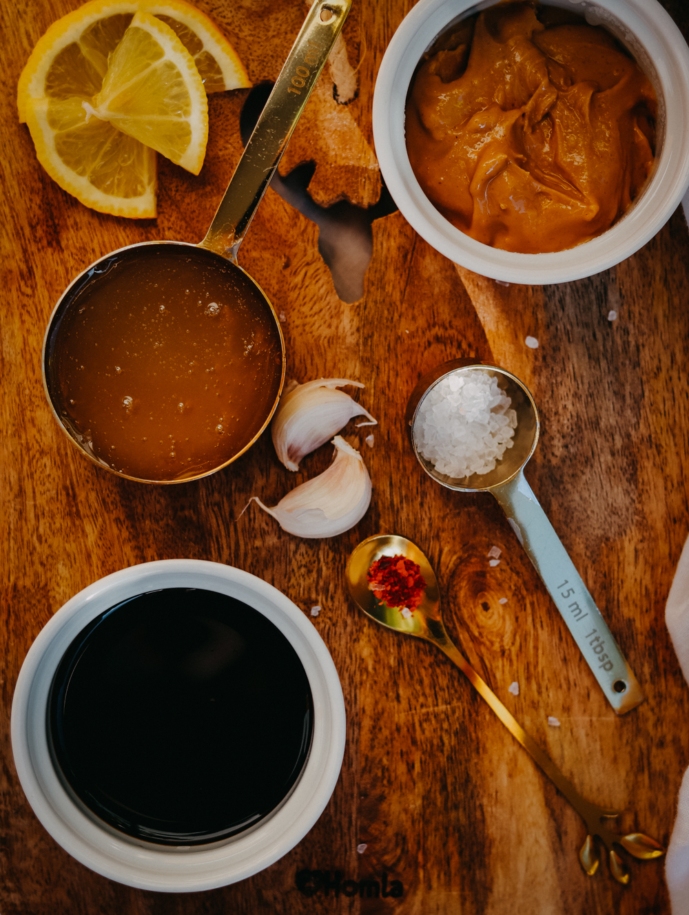 Czosnek obierz i przeciśnij przez praskę. Na patelni rozgrzej olej sezamowy, dodaj czosnek i przez chwilę podsmażaj do zrumienienia - ważne, żeby się nie przypalił, bo będzie gorzki. Na patelnię dodaj płatki chili, a potem dodaj sos sojowy i miód; podgrzewaj i mieszaj do połączenia składników. Na samym końcu dodaj szczyptę soli i masło orzechowe; mieszaj do uzyskania gładkiego sosu.