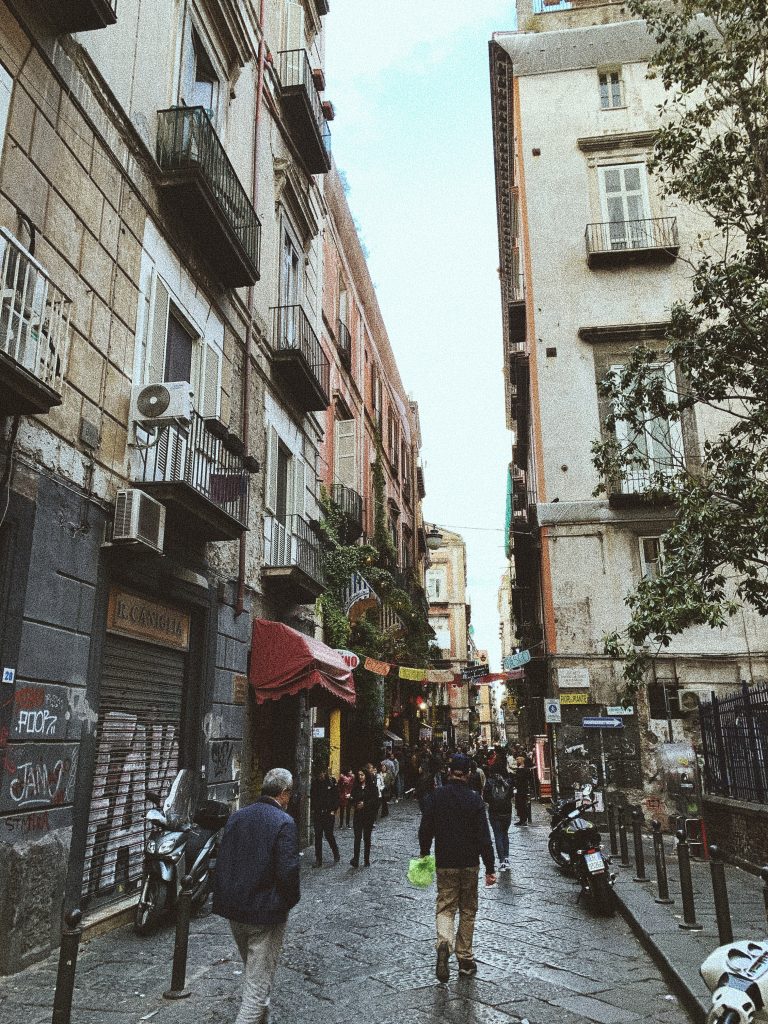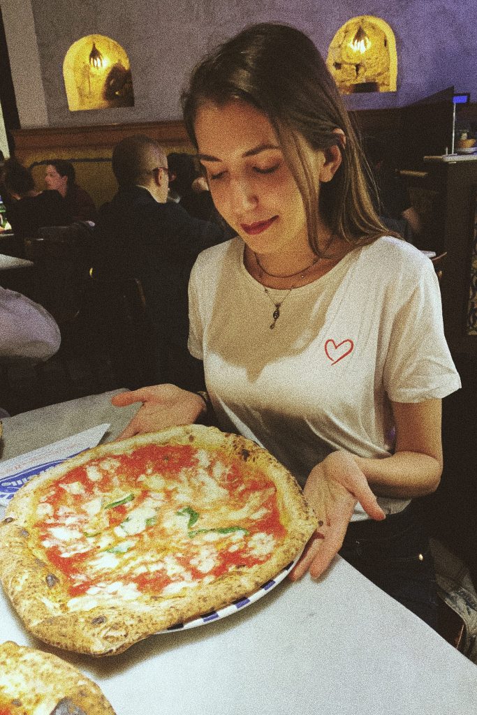 Дойде време и за най-важната част от Неапол – ПИЦАТА! Може би знаете, че това е родното място на пицата. В Италия има два вида – неаполитанска (с тънък център и дебела коричка) и римска (равна). Още преди няколко седмици бях започнала с проучването и знаех, че има две много, ама много известни места – Sorbillo и Da Michelle, която е известна от филма “Яж, моли се и обичай”, където Джулия Робъртс казва, че това е най-вкусната пица на света. Там обаче предлагат само две опции – Маринара и Маргарита. Ние се запътихме към Сорбило. Пицарията отваряше в 19ч (имат няколко часа почивка между обяда и вечерята) и бях подготвена, че се чака дълго. Отиваш и отпред вече има опашка. Откриваш “човека със списъка” казваш си името, колко души сте и чакаш. Евентуално по някое време ще те извикат по високоговорителя. Най-доброто е, че отсреща има малко магазинче, което продава вино за 2 евро чашата и всякакви други напитки (те май са най-печелившите от цялата еуфория покрай пицата хаха). Ние чакахме само 40 минути и накрая бяхме извикани. Като цяло беше доста вълнуващо преживяване да чакаш толкова дълго. Влязохме и се оказа, че заведението е доста голямо, а менюто също – имаха повече от 2 страници пици. Цените обаче бяха уааау! Маргаритата беше само 4 евро (за сравнение във Флоренция започваха от 7-8 евро), а това тук беше едно от най-туристическите и известни места в града – можеха да си позволят и по-високи цени. Пицата беше огрооооооомна! Беше вкусна, не мога да кажа дали най-невероятното нещо на света, тъй като когато си чакал 40 минути и си чел толкова много, вече не знаеш какво да очакваш хаха. Беше наистина много, ама много тънка, че чак не можеш да хванеш парчето и леко влажна в средата. Все пак смятам, че преживяването си струваше и изобщо не съжалявам, че отидохме и че чакахме толкова. На следващия ден на обяд попаднахме съвсем случайно на друга пицария, където пак имаше опашка за настаняване (какво става в тоя Неапол?!) и пицата беше мнооого вкусна! Имаха специален вариант с рикота в коричката, оформена като звезда. Имаха и опция за 8 парчета с различен вкус. Йеее!!!
