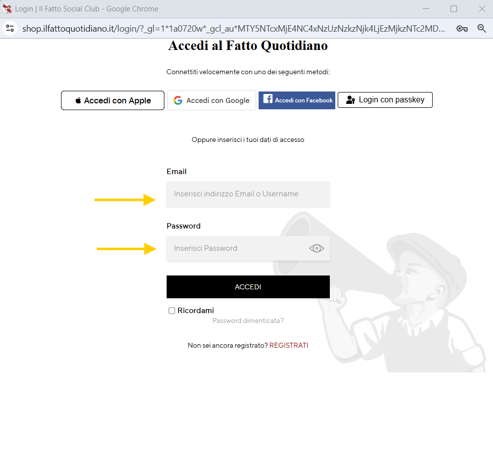 Ora inserisci le tue credenziali, ovvero l’email e la password che utilizzi per accedere al Fatto Quotidiano, e clicca sul tasto ENTRA.