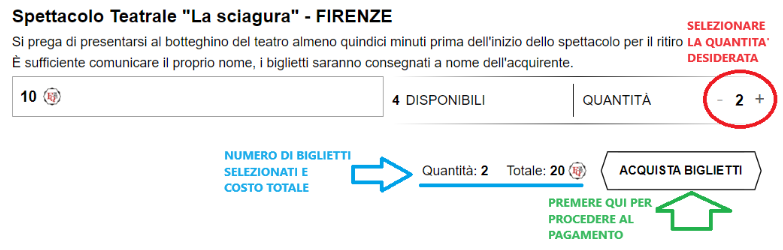 - Selezionare la quantità di biglietti che si vuole acquistare e premere su “Acquista biglietti”