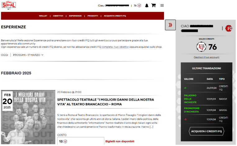 Una volta ottenuti i crediti, potrai usarli per acquistare biglietti per eventi, spettacoli, copie del quotidiano, copie del magazine, corsi o altro, che troverai nella sezione “Esperienze”, o “Prodotti”.