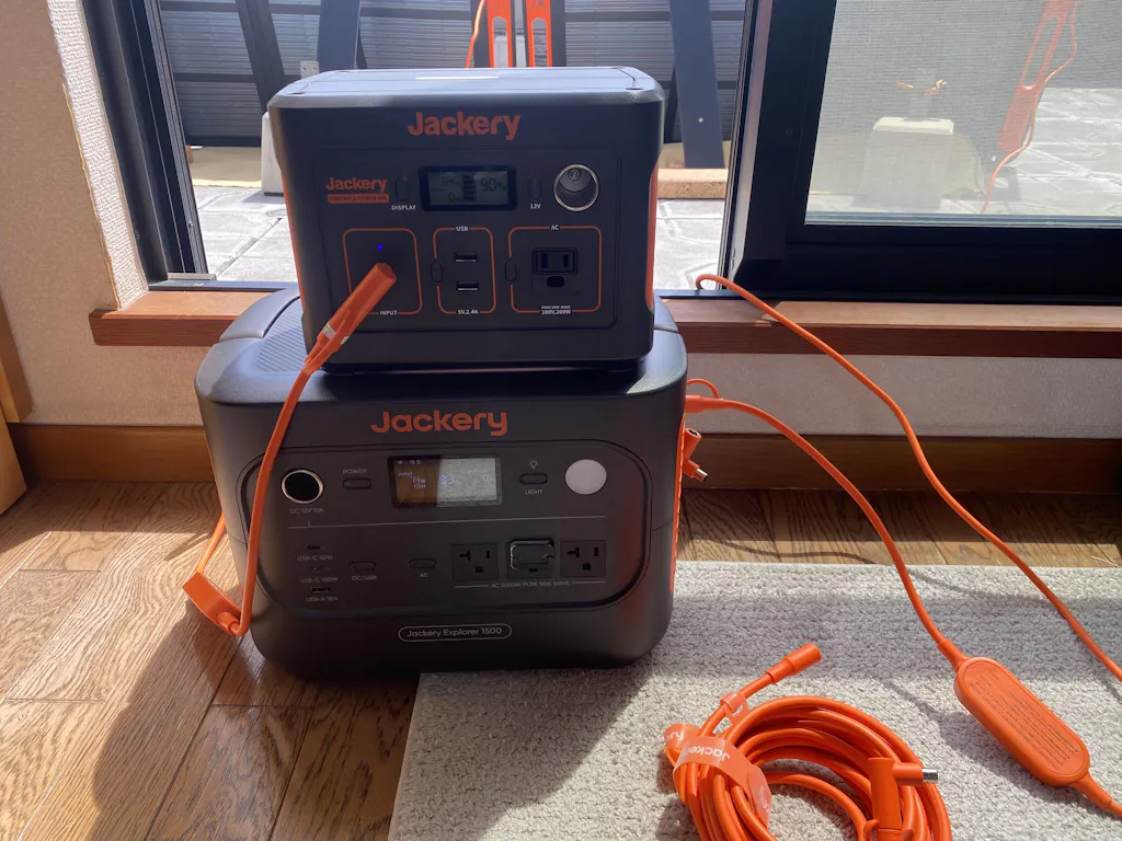 延長ケーブルを使用すると、電圧の降下が起こり、ポータブル電源へ供給される電力値が下がります。そのため、延長ケーブル使用前に比べ、同条件での充電時間が多少長くなります。