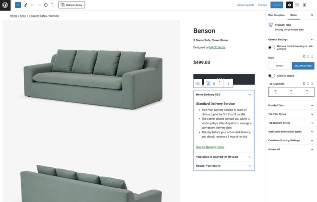 Build dynamic informational tabs using the WordPress block editor to unlock any kind of global tab layout you desire with Shop Kit’s custom template builder.
