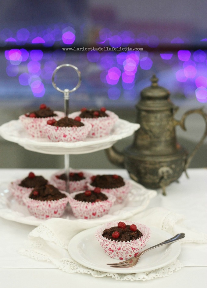 Schiaccia bene con una forchetta la frutta matura, unisci l'uovo e lo zucchero e mescola per fare amalgamare bene il composto. In una ciotola a parte miscela le farine con il cacao, il sale e il lievito. Unisci le polveri all'impasto, poco per volta, e mescola il tutto fino ad ottenere un composto piuttosto sostenuto. Unisci quindi una manciata di chicchi di ribes, mescola bene e dividi il composto nei pirrottini dello stampo da muffins (basterà per 12 tortine). Decora con ancora qualche chicco di ribes e  inforna a 180° per circa 20-25 minuti. Per assicurarti della cottura fai sempre la prova stecchino.