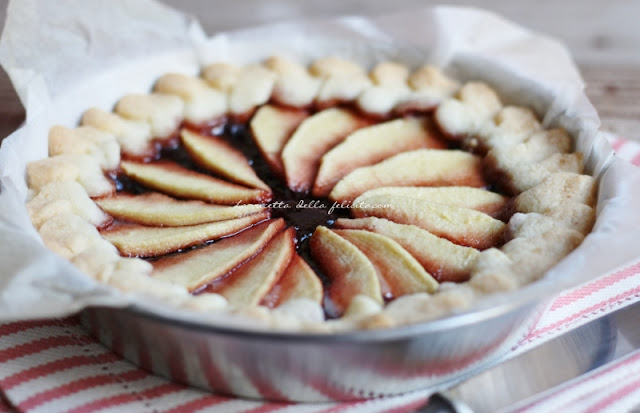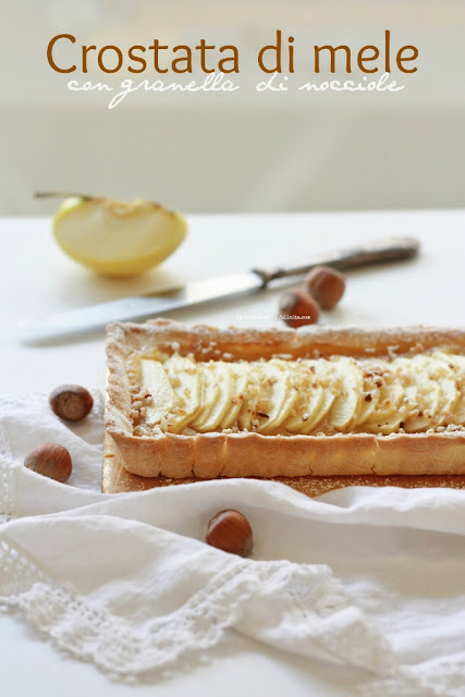 Vi lascio questa idea: è una crostata fatta con la mia base preferita a cui ho aggiunto una composta di mele fatta per utilizzare della frutta non proprio "in perfetta forma", per cui ho tolto via le parti marce e il resto l'ho tagliato a dadoni e l'ho cotto e frullato. E per finire qualche cucchiaio di granella di nocciole per avere un contrasto croccantino.