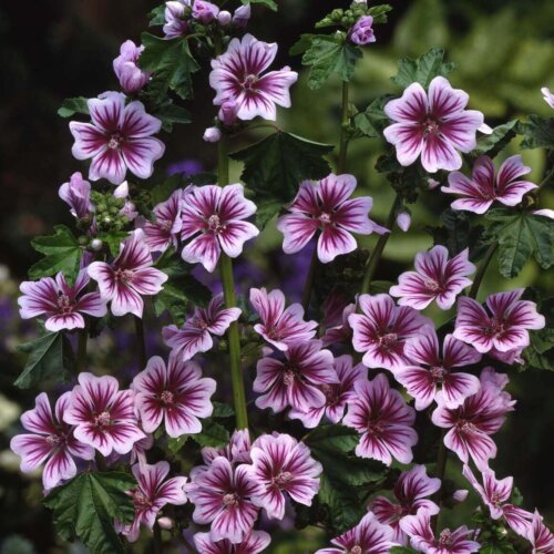 A good back-of-the-border plant that grows to 150 cm tall. Strong, erect stems are loaded with 5 cm, cup shaped, mauve-pink flowers that are heavily veined with a velvety-purple. An old fashioned favourite that is widely distributed in the Old World! Tender perennial Hardy to Zone 5 with protection or Zone 6 without. We suggest in most places in Canada, Malva is best grown as an annual.