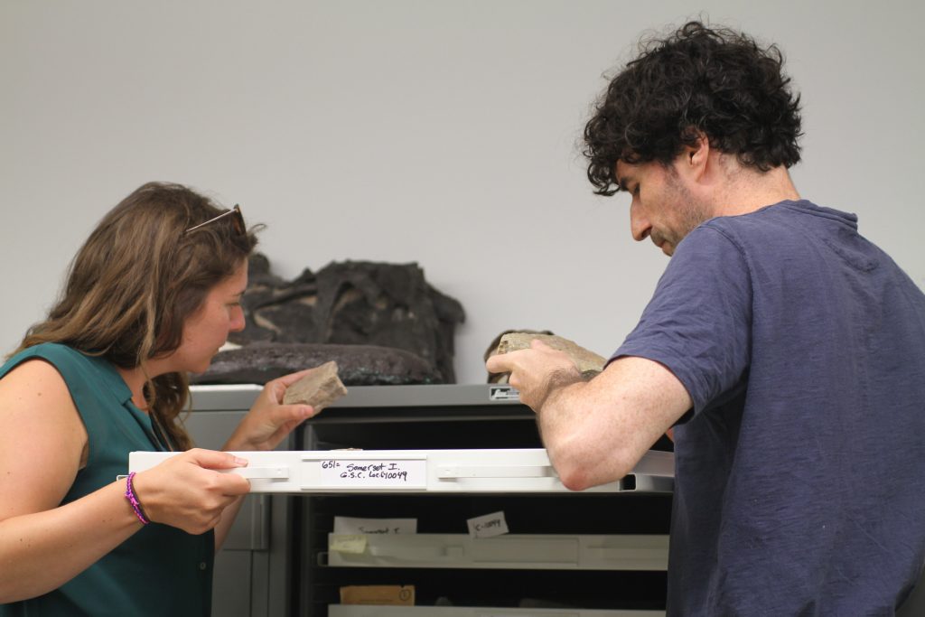 Here Dave and Emma are sampling a potential bed, whilst searching the loose rocks below for any signs of fossils. -