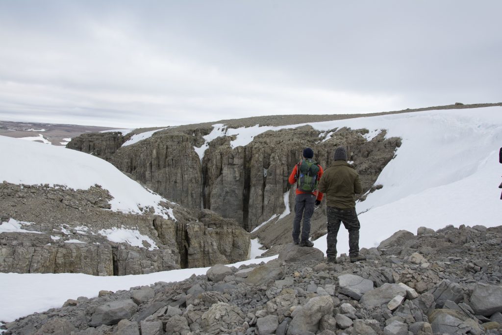 Whilst we were on standby for a helicopter pickup, we had to be ready to leave the field at a moment’s notice. This meant that we couldn’t stray far from our camp site, so fieldwork was off the cards. We decided, however, to go for a stroll to the peninsula overlooking Read Bay and it was from this viewpoint we saw our first (and only) polar bear. This terrifying little white dot just slowly moved around the horizon, occasionally stopping to survey the landscape. You’d be forgiven for not having spotted it, but Randy’s sharp and trained eyes spotted it pretty quickly. He informed us that if we’ve managed to spot it, it probably would already been aware of our presence long before. Comforting.
