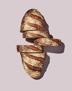 three pieces of bread are arranged in the shape of four slices on a blue background