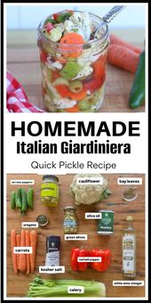 a jar filled with pickled vegetables sitting on top of a wooden cutting board next to garlic