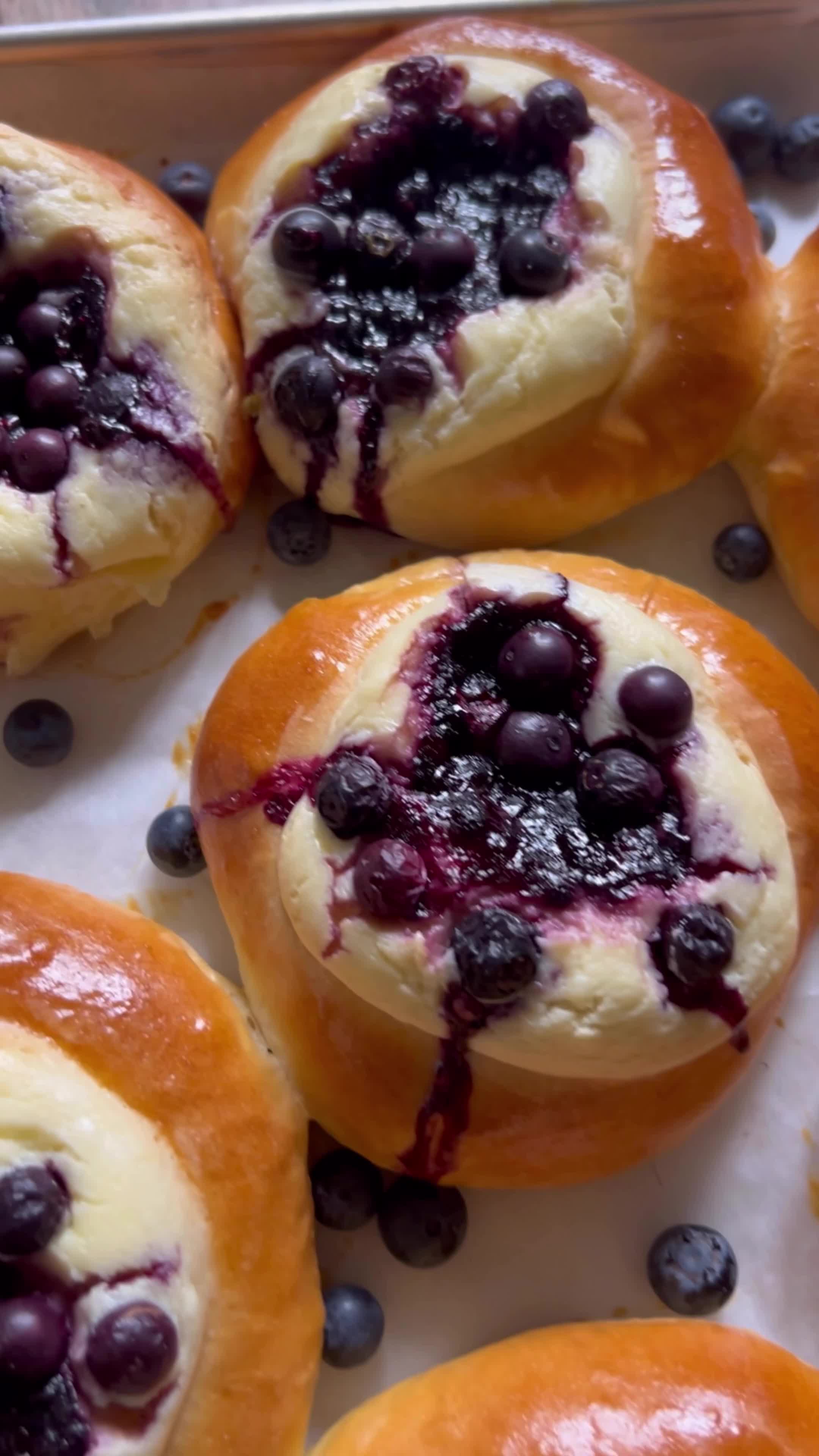 These Blueberry Cream Brioche Buns must be on your next brunch table! Pillowy sweet brioche topped with sweet vanilla cream cheese, blueberry preserves and fresh blueberries.