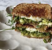 garlic chicken with creamy pesto & avocado on grilled sourdough bread.