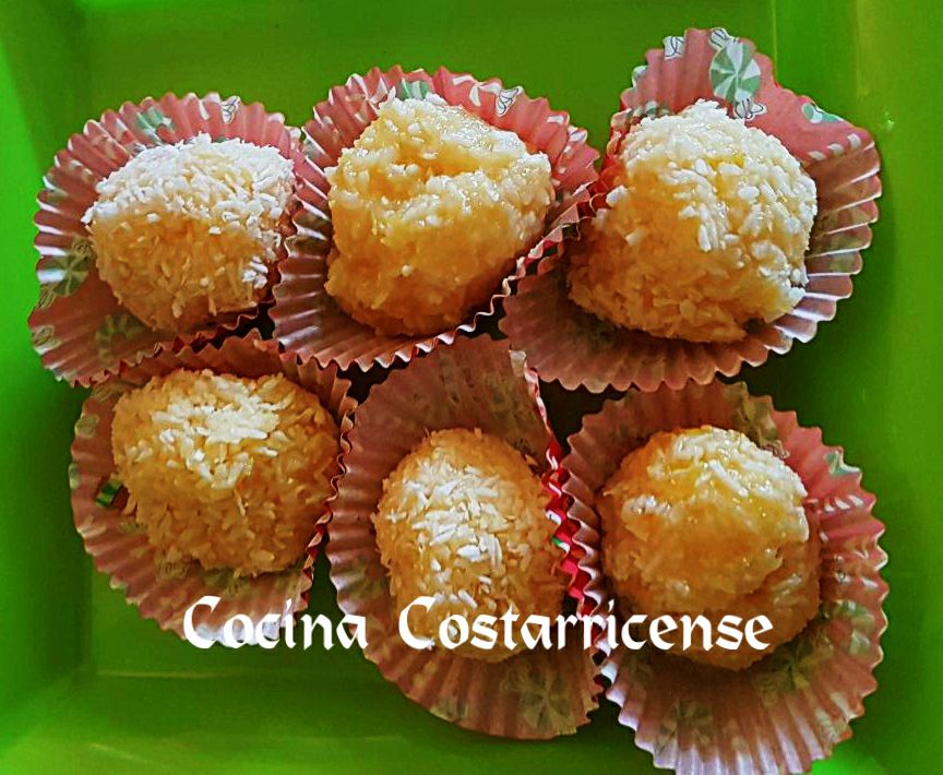 Ahora sí, con ayuda de una cucharita haga bolitas y páselas por azúcar mezclada con coco rallado. Sírvalas en cápsulas de papel, ó sobre una hojita de limón tierno o naranja y dese un gustico tico!