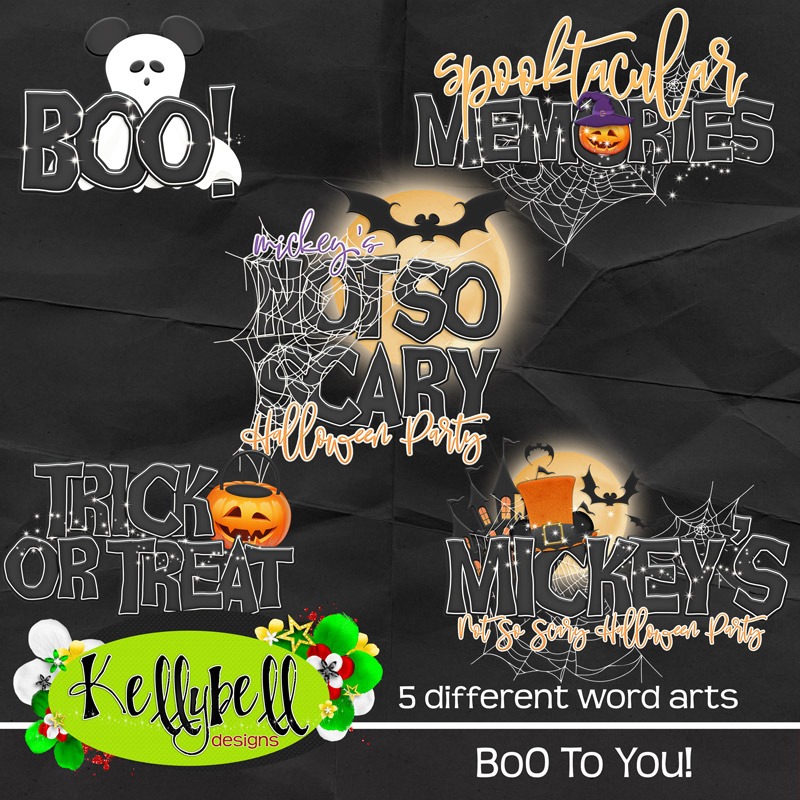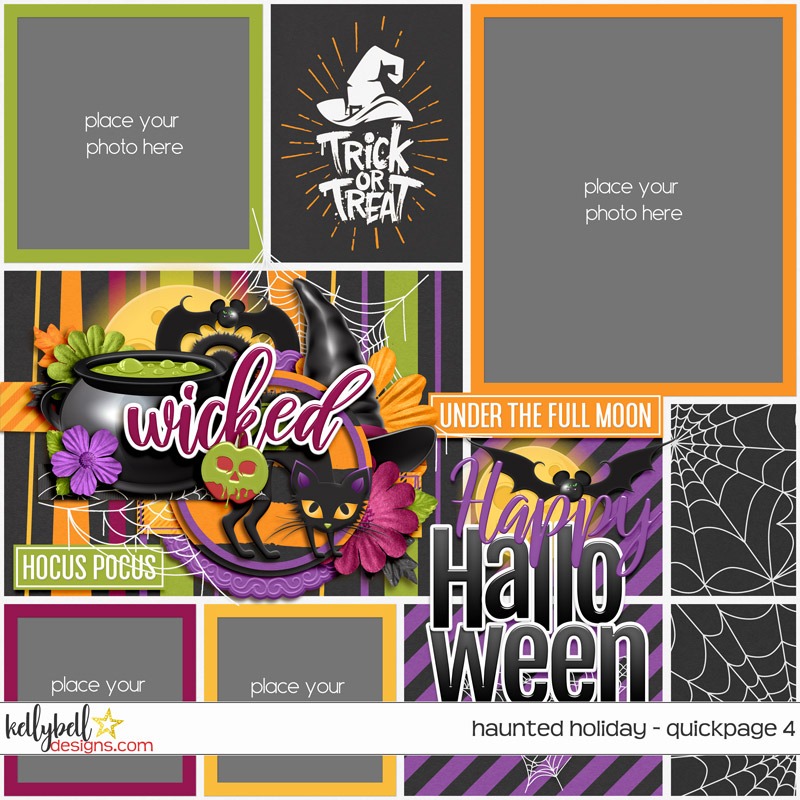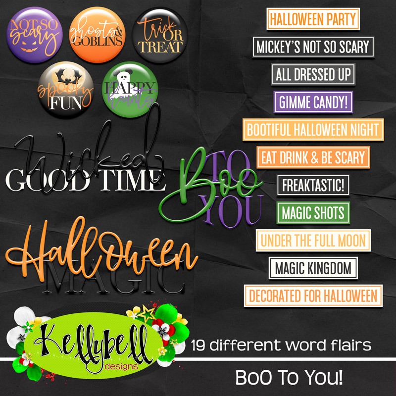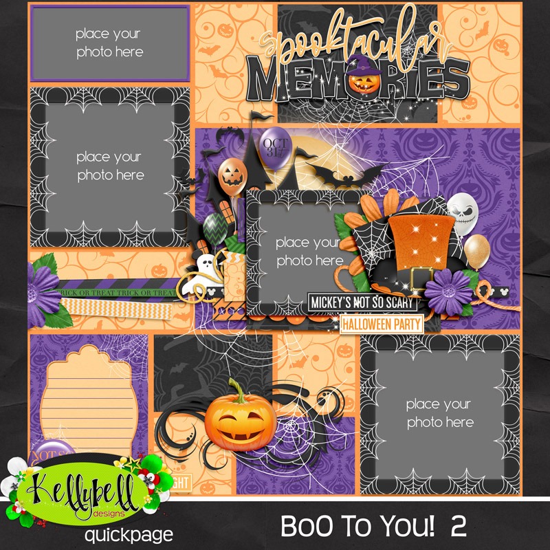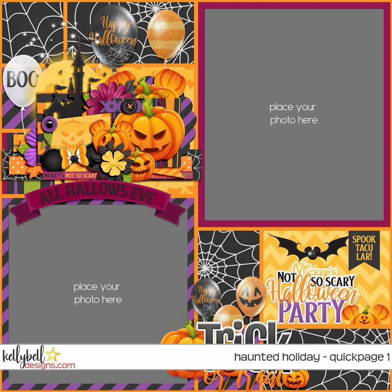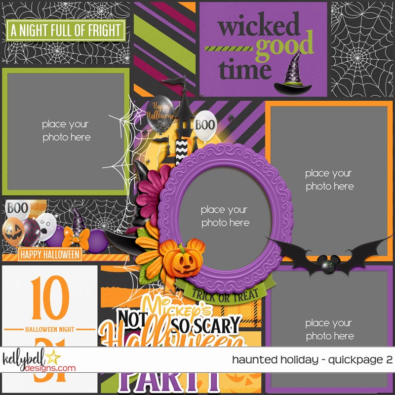 t’s time for happy haunts to come out to play! Kelly’s newest collection, Haunted Holiday, is perfect for Walt Disney World’s Mickey’s Not So Scary Halloween Party or Disneyland’s Oogie Boogie Bash. Use this fun collection to create spooky layouts of trick or treating, costume parades, and neighborhood and community parties. Don’t forget to add on the coordinating Page Starters, Journal Cards, Word Art, Word Flair and Quick Pages.