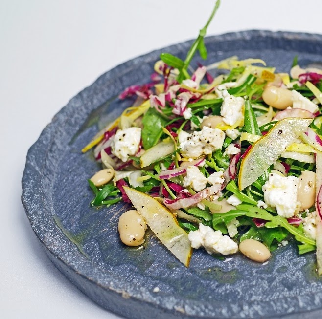 Salatsorten in eine größere Schüssel füllen, die Birnenscheiben sowie den