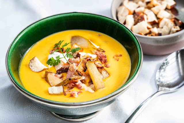 Eine weitere Variante einer Kürbis-Suppe, diesmal mit Speck und Birnen.