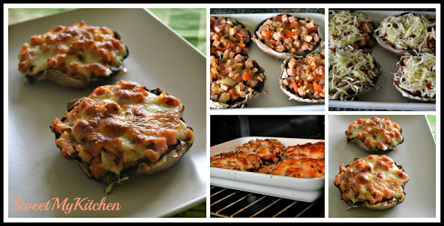 - Por cima da massa, espalhe o frango desfiado, os cogumelos e o bacon, disponha as fatias de mozzarella.
