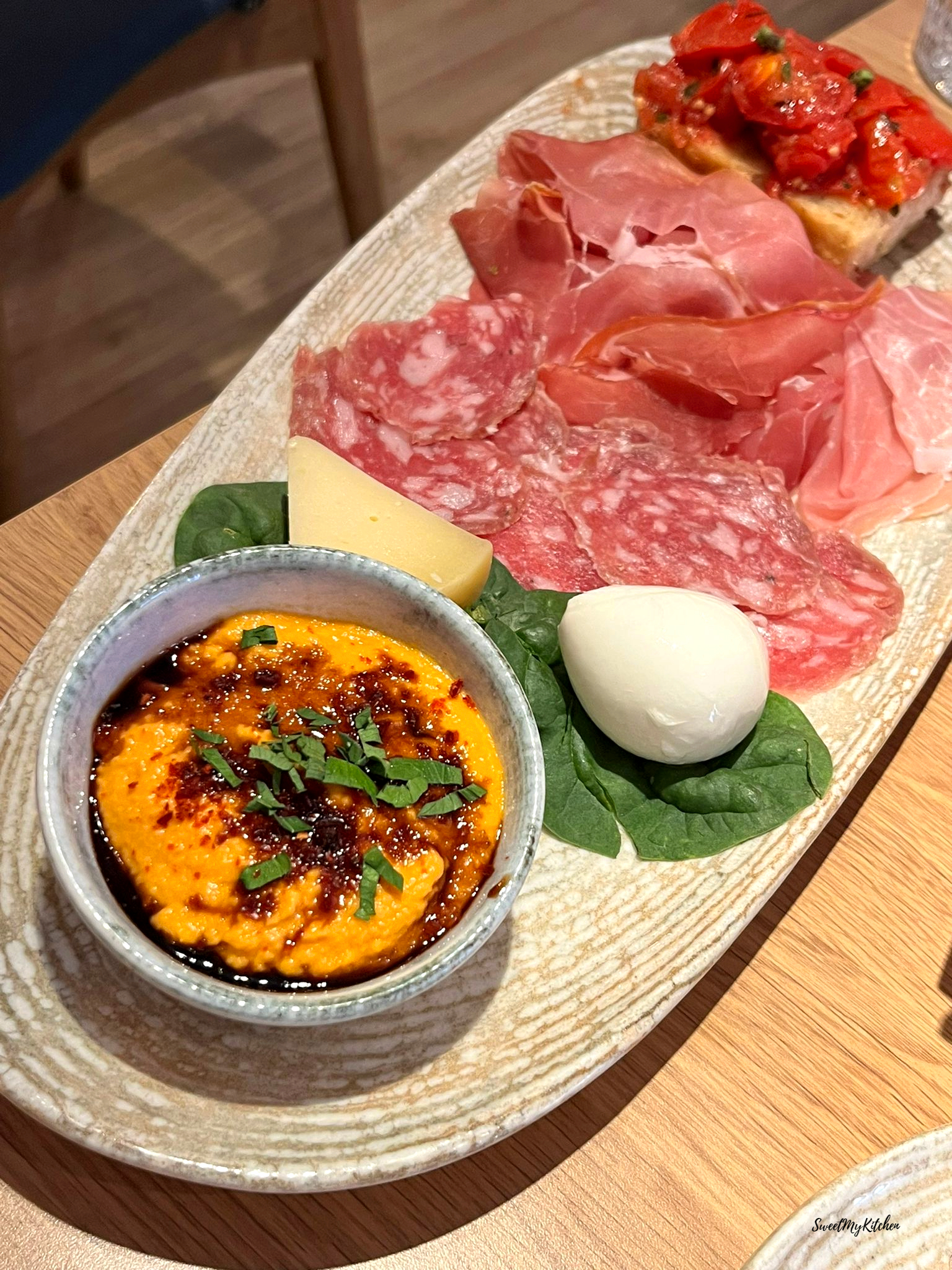 Começamos com uma Piccola degustazione, uma excelente forma de provar diversos produtos italianos e é perfeita para partilhar; desta degustação fazem parte prosciutto di parma DOP, salame piacentino dop, bocconcini di mozzarella di bufala campana DOP, caciocavallo irpino, crostino di pomodorino del piennolo del vesuvio dop em pacchetelle, e hummus de pimento vermelho.