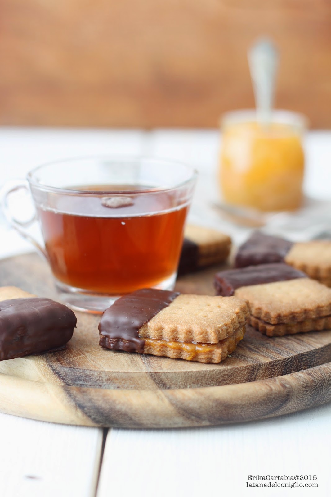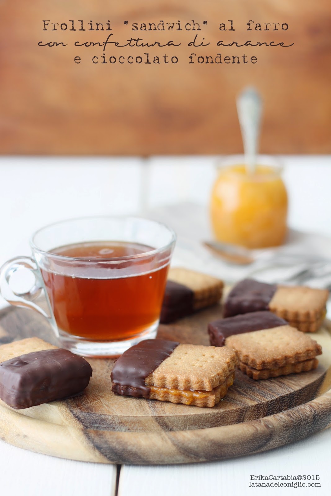 L'operazione svuota frigo ha fatto in modo che recuperassi un po' di confettura di arance amare, che in casa mia pochi si filano, e un generoso panetto di pasta frolla. Sono nati così questi piccoli sandwich di frolla al farro, ripieni di profumatissima confettura di arance amare e ricoperti di goloso cioccolato fondente. Perchè il connubio cioccolato fondente e arance è qualcosa per cui perdere la testa, se poi ci aggiungete il fatto che la frolla al farro ha quel sapore vagamente rustico, sono sicura che non potrete fare a meno di resistere a queste piccole delizie.