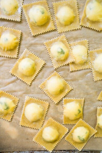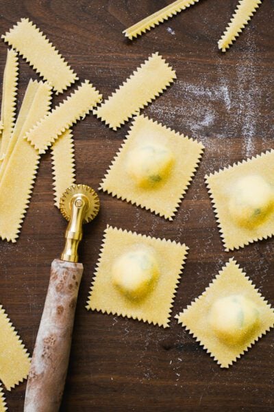 This is the fun part! Cut the ravioli in half with a ravioli cutter and then into strips. Trim into 2 1/2- 3-inch ravioli squares. You’ll end up with lots of pasta scraps (jump here for ways to utilize them). Place onto a parchment-lined sheet pan dusted with semolina flour. Keep covered while you make the the rest.