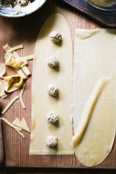 Then cut a pasta sheet in half. Dollop the meat filling down the center spaced 2 finger-widths apart.
