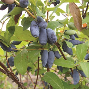 An attractive hardy bush, haskaps are the earliest berries to ripen. At first glance haskaps look like oddly shaped blueberries. Some consider the fruit to taste like a mix of blueberry and raspberry while other will disagree, arguing that the distinct sweet-tart flavour is difficult to pinpoint. Haskaps are very disease and pest resistant. Loaded with vitamin C and antioxidants, haskaps are an unusual and unique berry perfect for our cold climate.