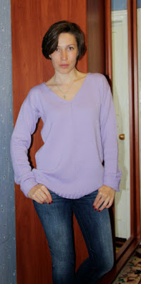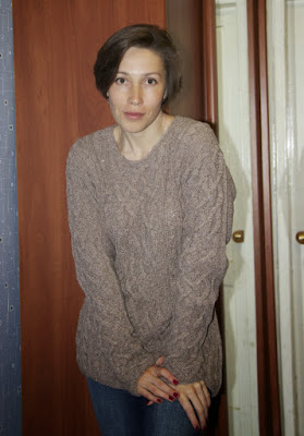 Второй свитер - модель № 6 из сентябрьской "Сабрины" за 2013 год, бобинная пряжа: кашемир + шелк, ушло где-то грамм 500, спицы 3,25. Очень красивое меланжевое полотно, но фото ужасные совершенно, на улице лили дождь, все со вспышкой, ничего не видно. Выкладываю фото процесса в заглавные, чтобы было понятно.