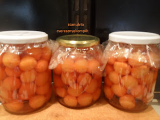 Kimostam alaposan forró, mosószeres vízben a 3 üveget meg a tetejüket, majd a megmosott leszárazott cseresznyével megtömtem jó alaposan, le is nyomkodtam, egyenként megtöltöttem hideg vízzel és egy lábosba azonnal át is öntöttem a vizet róla, amikor minddel megvoltam, odatettem felforralni a vizet, itt lehet hozzákeverni cukrot, édesítőt, ki mivel és hogyan akarja, de cukor nélkül is működik, csak a sima forró vízzel. Tehát vagy szirupot készítek, vagy a sima forró vizet pár percig forraltam, majd visszameregettem az üvegben várakozó csersznyeszemekre, celofánt raktam mindre, és rácsavartam a tetőket. Elhatároztam, hogy most vizes dunsztolást csinálok, azaz egy nagy fazékba, vagy kuktába újságpapírt tettem, beleállítottam az üvegeket, ne érjenek össze, és felöntöttem meleg vízzel az üvegek majdnem tetejéig, majd felforraltam.Kuktában csak a jelig szabad feltölteni, tovább nem, felforralás után, amikor sípolni kezd, takarékra venni. A lábasban is ugyanígy takarékon, tetővel félig rajta, 20-25 percig rotyogtatni kell, majd a lángot elzárni és úgyhagyni kihűlni.Másnap, egyenként kivenni, áttörölni és mehet a spájzba.