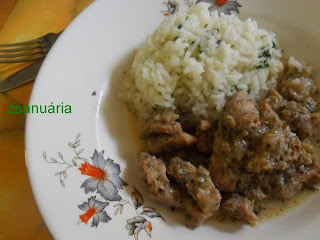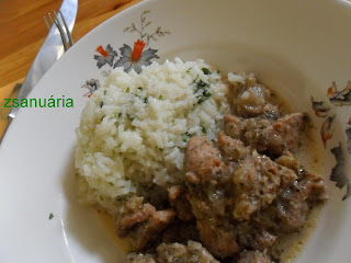 Közben a szokásos módon rizst készítettem, azaz kevés olajon megpirítottam a rizst, felöntöttem dupla mennyiségű vízzel, sóztam, jó sok petrezselymet szórtam rá és kb. 10 perc alatt puhára főztem.