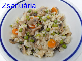 Egy másik lábasban, szintén kevéske olajon a karikára vágott répákat, zellert megpirítom, majd amikor kiadta a sárgás színét a sárgarépa, hozzáadom az apróra vágott vöröshagymát és együtt dinsztelem tovább. Ezután jön hozzá a feldarabolt gomba, fedő nélkül addig dinsztelem az egészet, amíg a levét elfövi és zsírjára sül. Ezalatt az idő alatt bőven megpuhul minden, sózom, borsozom és legvégül összeforgatom a rizzsel.