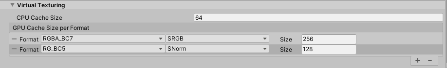 Virtual Texturing allocates the GPU cache of a given graphics format when it renders a Material that has a Texture Stack with a texture that uses that format. You can configure the cache size (in MB) on the HDRP Asset, which allows you to have different configurations for each quality level.