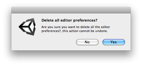 public class DeleteAllExample : ScriptableObject { [MenuItem("Examples/EditorPrefs/Clear all Editor Preferences")] static void deleteAllExample() { if (EditorUtility.DisplayDialog("Delete all editor preferences.", "Are you sure you want to delete all the editor preferences? " + "This action cannot be undone.", "Yes", "No")) { Debug.Log("yes"); EditorPrefs.DeleteAll(); } } }