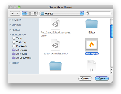 public class OpenFilePanelExample : EditorWindow { [MenuItem("Example/Overwrite Texture")] static void Apply() { Texture2D texture = Selection.activeObject as Texture2D; if (texture == null) { EditorUtility.DisplayDialog("Select Texture", "You must select a texture first!", "OK"); return; }