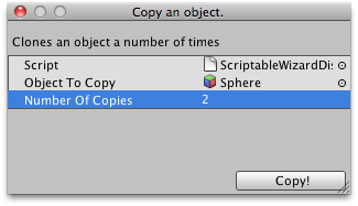 public class ScriptableWizardDisplayWizard : ScriptableWizard { public GameObject objectToCopy = null; public int numberOfCopies = 2; [MenuItem("Example/Show DisplayWizard usage")] static void CreateWindow() { // Creates the wizard for display ScriptableWizard.DisplayWizard("Copy an object.", typeof(ScriptableWizardDisplayWizard), "Copy!"); }