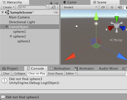 //But we can access it with '/' character or by using GetChild() Transform newresult; newresult = gameObject.transform.Find("sphere2/sphere3");