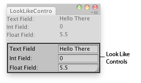 void OnGUI() { EditorGUIUtility.LookLikeInspector(); EditorGUILayout.TextField("Text Field:", "Hello There"); EditorGUILayout.IntField("Int Field:", integer1); EditorGUILayout.FloatField("Float Field:", float1); EditorGUILayout.Space(); EditorGUIUtility.LookLikeControls(); EditorGUILayout.TextField("Text Field", "Hello There"); EditorGUILayout.IntField("Int Field:", integer1); EditorGUILayout.FloatField("Float Field:", float1); } }
